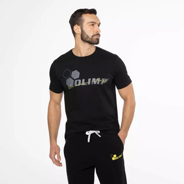The Olimp Men T-Shirt in black is an ideal choice for men who value the comfort and quality of the clothing they wear. A large T-shirt with the Olimp logo on the chest and a motivational slogan on the back does not restrict movement, fits perfectly to the body, emphasizing an athletic figure. The Olimp men's T-Shirt can be worn every day with your favorite jeans or worn for training, a bike ride, morning or evening jogging or other physical activity.